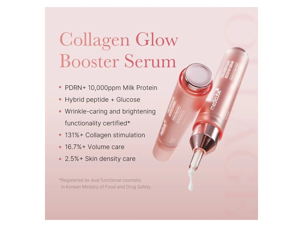 | Medicube Collagen Glow Booster Serum je pokročilé pleťové sérum, ktoré kombinuje silu kolagénu, peptidov a hydratačných zložiek, aby navrátilo pleti mladistvý, žiarivý vzhľad. Zloženie séra intenzívne hydratuje, vyhladzuje vrásky a zlepšuje pružnosť pokožky, zanecháva ju hladkú, pevnú a plnú lesku. Ideálne pre ľudí, ktorí hľadajú účinné riešenie na príznaky starnutia pokožky. |