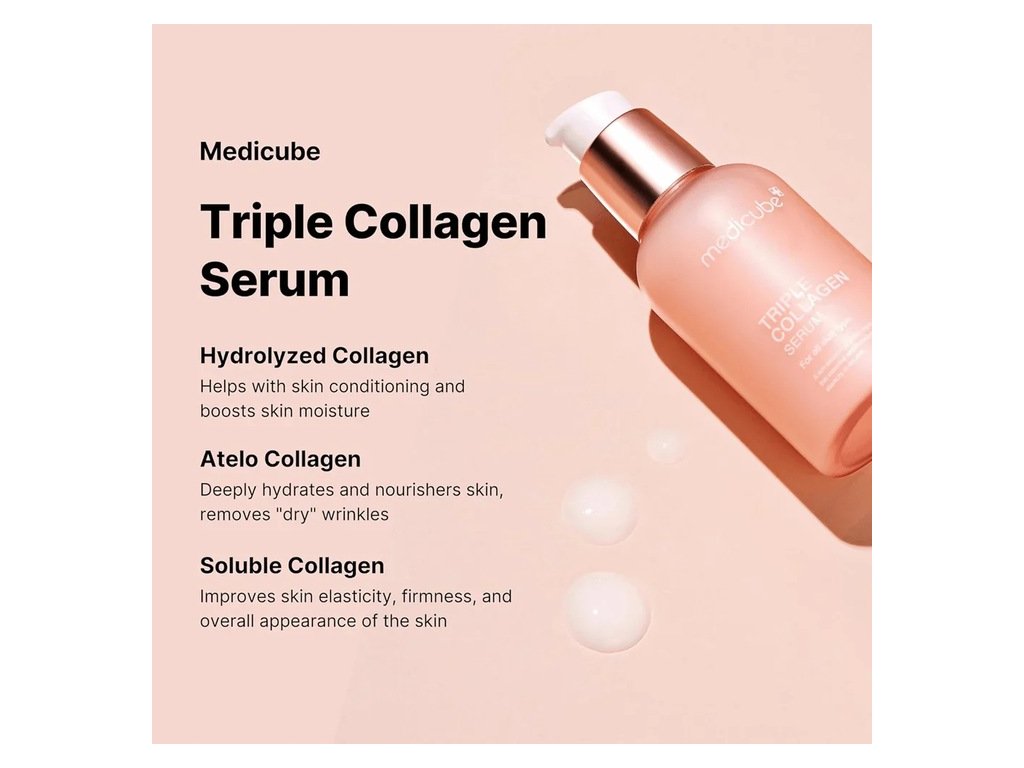 | Medicube Triple Collagen Serum 4.0 je pokročilé sérum proti starnutiu, ktoré intenzívne hydratuje a spevňuje pokožku. Vďaka trojitej dávke kolagénu produkt podporuje regeneráciu pokožky a znižuje viditeľnosť vrások. |